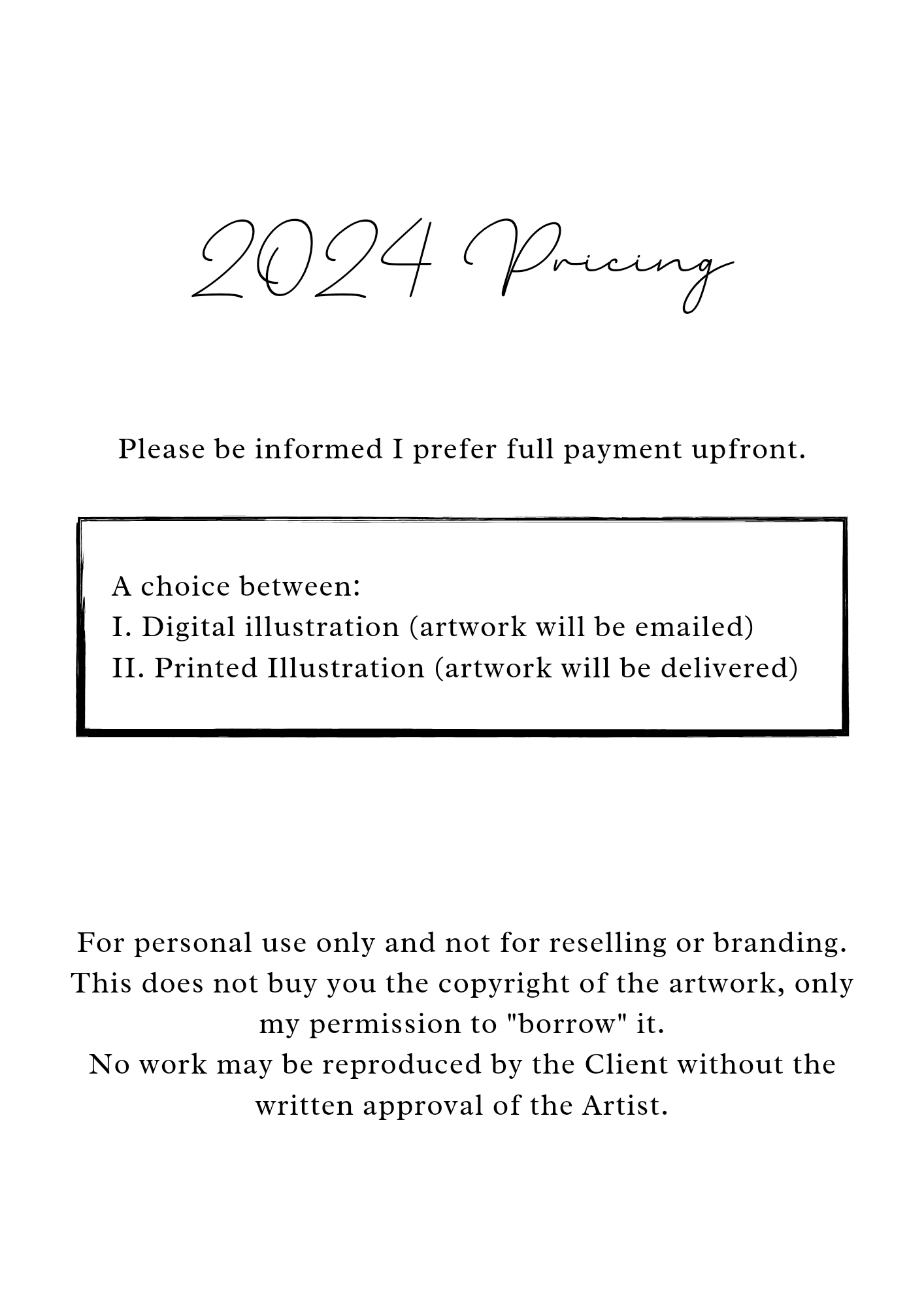 Only the deposit is required to secure your booking dates/ month(s), whereby the remaining amount is payable upon completion of your digital illustrations. T's and C's apply.
