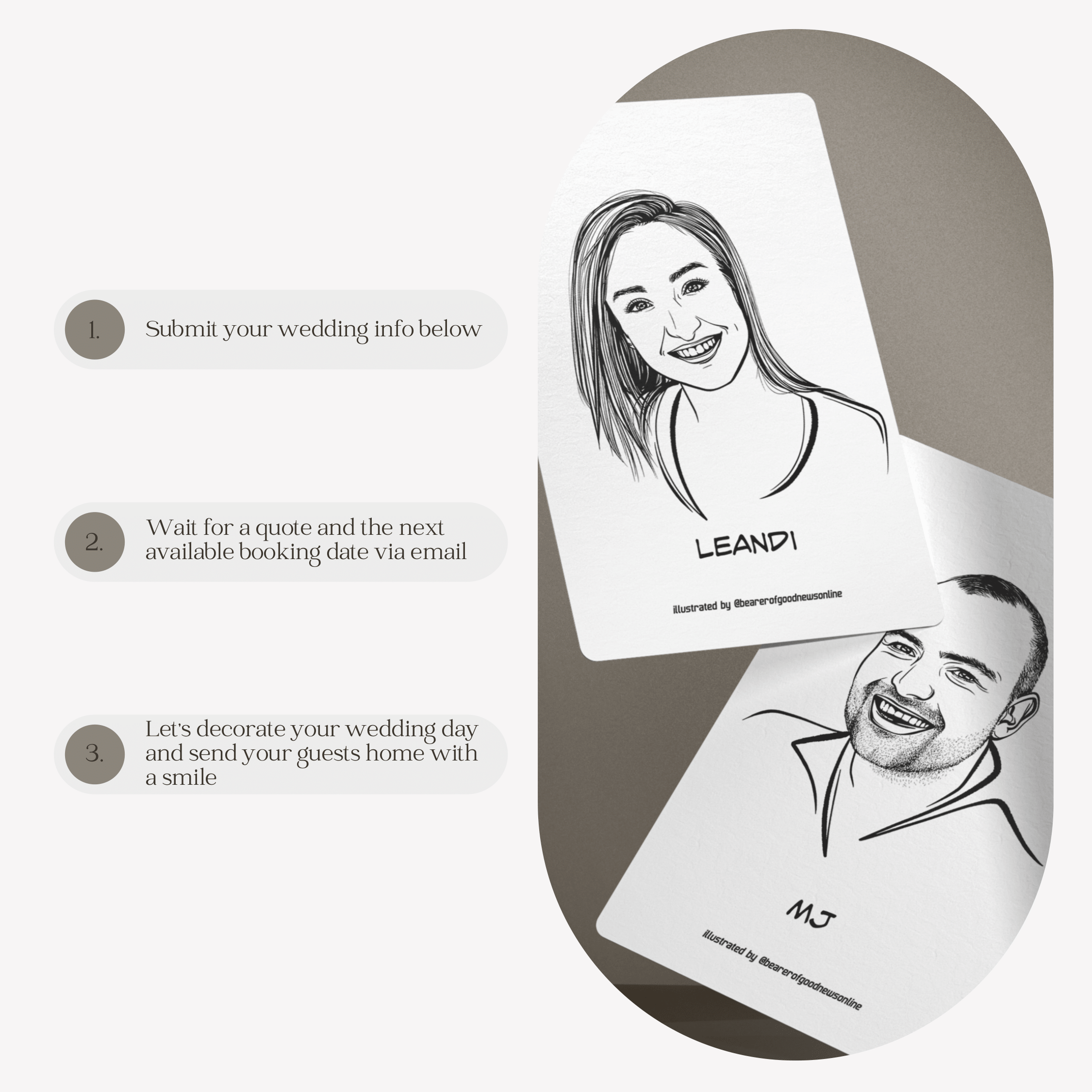 Note that I create your illustrations digitally and I price per subject/ face. This means the price per guest illustrated remains the same, regardless of size and layout (single or two people drawn together etc). This price includes possible modifications needed to be done at the end of the illustration process.